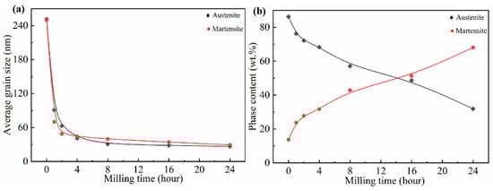 Figure 5, increasing the ball milling time transforms the austenite phase in the composite powder into the martenite phase. Both the austenite and martenite grain sizes continuously decrease to about 30 nm, and the martenite content reaches approximately 70% after 24 h of ball milling.