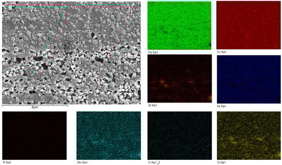 Figure 7 presents the SEM images of the sintered bodies fabricated via SPS of VGCF/304L stainless steel powders that have undergone 16 h ball milling. Additionally, the EDS elemental distribution maps across their surfaces are also shown. As can be seen from the figure, the elemental distribution of the sintered material is relatively uniform. However, there are some bright spots in the distribution maps of silicon and oxygen elements. This is likely due to incomplete cleaning during the sample preparation process, causing a small amount of silica polishing liquid to remain on the sample surface.