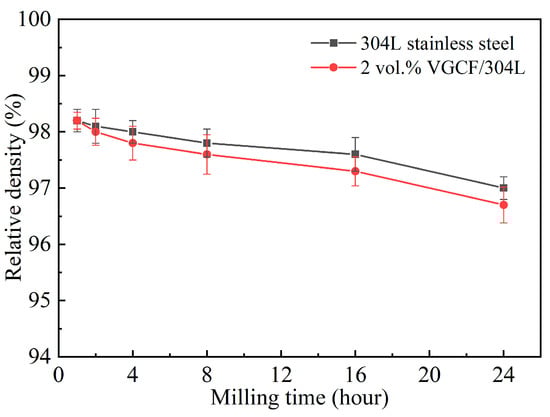 Figure 8 shows the relative densities of 304L stainless steel and VGCF/304L composite after different ball milling times. The theoretical density of the VGCF/304L composite is about 7.81 g/cm