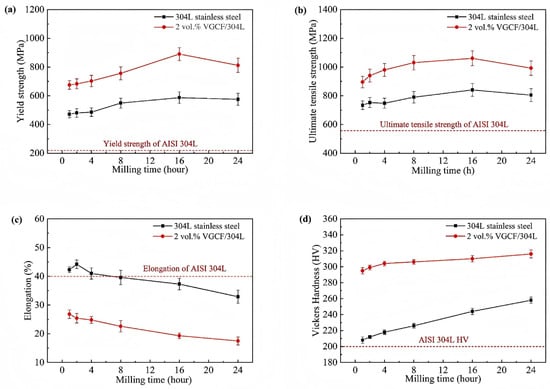 Figure 9a,b, with longer ball milling times, the strength of both 304L stainless steel and composite materials increases. At 16 h of ball-milling, both exhibit peak strength, with yield strengths of 587.1 MPa and 890.2 MPa, respectively, and ultimate tensile strengths of 821.5 MPa and 1064.7 MPa, respectively. The composite material shows significantly higher strength than 304L stainless steel. According to