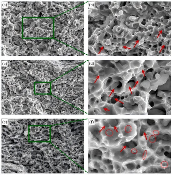 Figure 11 shows SEM images of the tensile fracture surface of VGCF/304L stainless steel SPS sintered bodies after 1, 8, and 16 h of ball milling. The figure reveals evenly distributed toughness nests at the fracture joints, indicating typical ductile fracture characteristics. The tensile fracture of the composite material comprises numerous small, round ductile dimples. There are some residual pores and cracks near the ductile dimples after sintering, which serve as the primary fracture source during deformation. In addition, there are a few bonding phase particles in the ductile dimples and carbides formed by decarbonization during the martensite annealing process, with some falling off during deformation. The amount of the second phase and inclusions in the sintering body fractures gradually decreases as ball milling time increases, becoming almost absent in