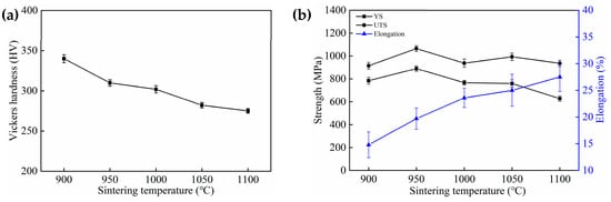 Figure 12b, the yield strength increases from 784.2 MPa to 890.2 MPa and then decreases to 628.4 MPa, while the ultimate tensile strength increases from 915.2 MPa to 1064.7 MPa and then drops to 936.4 MPa. Elongation improves from 14.8% to 27.5% as the temperature rises. A comprehensive analysis indicates that a sintering temperature of 950 °C results in the best overall mechanical properties.
