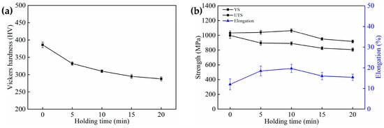 Figure 13a, the Vickers hardness decreases from 386 HV to 288 HV as the insulation time increases from 0 to 20 min. Notably, hardness drops significantly between 0 and 10 min but shows less variation between 10 and 20 min. As shown in