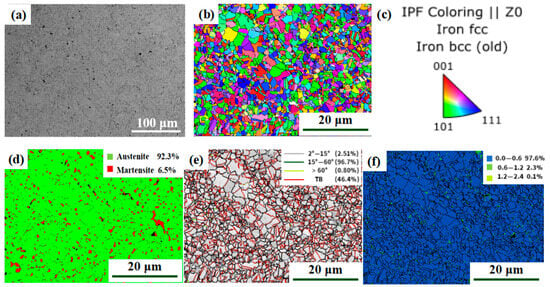 Figure 14f shows the kernel average misorientation (KAM) map. The KAM values of the 304L stainless steel are mainly between 0–0.6°, accounting for more than 97% of the material. This suggests low internal stress and dislocation density, with stress concentration at the high-angle grain boundaries and twin boundaries.