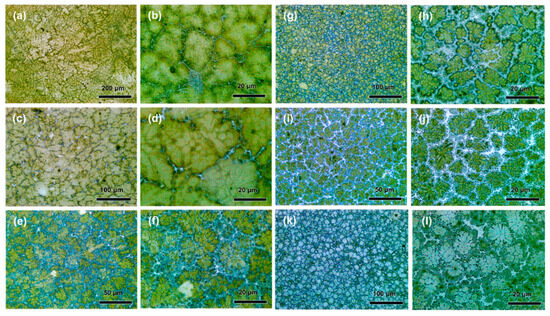 Metallography images of the as-cast AlCrFe2Ni2Tix alloys: (a) Ti0, (c) Ti0.2, (e) Ti0.4, (g) Ti0.6, (i) Ti0.8, and (k) Ti1.0; (b), (d), (f), (h), (j), and (l) are enlarged images of (a), (c), (e), (g), (i), and (k), respectively.