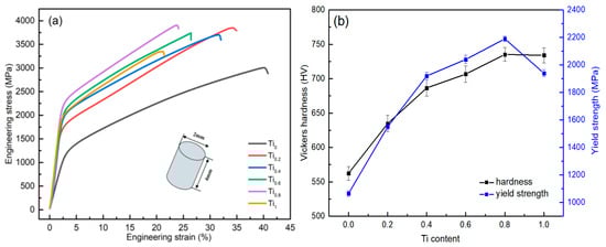 (a) Compressive engineering stress–strain curves of the AlCrFe2Ni2Tix alloys. (b) Yield strength and Vickers hardness of the AlCrFe2Ni2Tix alloys.