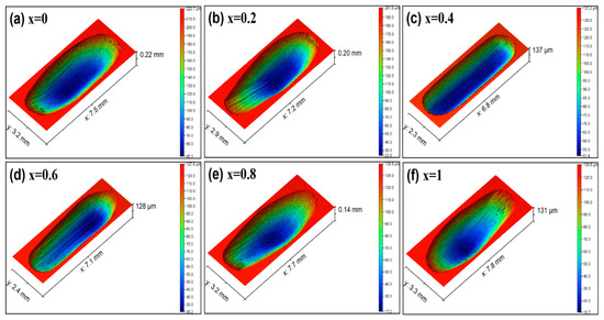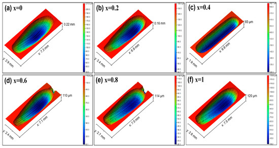 Confocal laser three-dimensional (3D) wear surface morphology of AlCrFe2Ni2Tix (x = 0, 0.4, 0.6, 0.8, 1) under 5 N: (a) Ti0, (b) Ti0.2, (c) Ti0.4, (d) Ti0.6, (e) Ti0.8, (f) Ti1.