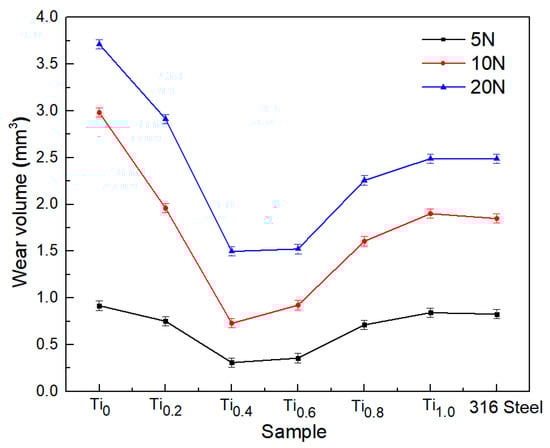 Wear volume trends of the AlCrFe2Ni2Tix HEAs at loads of 5 N, 10 N, and 20 N.