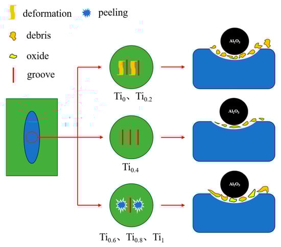 Schematic diagram of the wear mechanism of the AlCrFe2Ni2Tix HEAs.