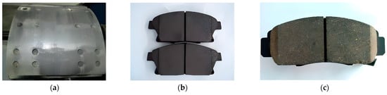 Brake pads matched with the brake drum for wear experiments. (a) Semi-metallic brake pad; (b) NAO brake pad; (c) ceramic brake pad.