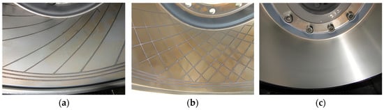 To form the bionic structure surface on the brake drum, the striped unit brake drum (“scallop” surface feature), the grid unit brake drum (“dragonfly wings” surface feature), and the untreated brake drum were prepared before the bench test, respectively, as shown in Figure 6.