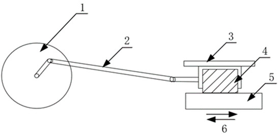 Schematic diagram of linear reciprocating sliding friction wear test bench. Note: 1. Motor runner, 2. linkage mechanism, 3. load, 4. brake drum specimen, 5. brake pad specimen, 6. friction direction.