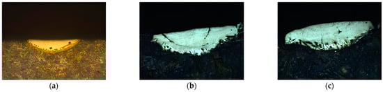 Figure 9 shows the cross-section of different shapes of units formed by laser machining perpendicular to the surface of the bionic brake drum, the white part of which are the units. Macroscopically, the units are dissected, and their cross-sectional shapes are essentially the same, taking the form of a semi-circular body, as shown in Figure 9.