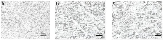 The graphite type primarily consists of Type A, accompanied by a minor proportion of Type B flake graphite, as depicted in Figure 1a. The matrix organization is predominantly pearlite, accounting for over 90% of the composition, with a small amount of ferrite present, as illustrated in Figure 1b,c. The primary chemical compositions are outlined in Table 1.