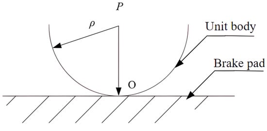 Let the spherical radius of the point unit body be ρ, the positive pressure of the unit body perpendicular to the surface of the brake pad be P, and O be the initial contact point between the unit body and the brake pad. The hardness of the unit body is high, and the deformation after the force is negligible; while the hardness of the brake pad is low, and the elastic deformation will be produced under the positive pressure of the unit body, so that the point O will move downward, as shown in Figure 12.