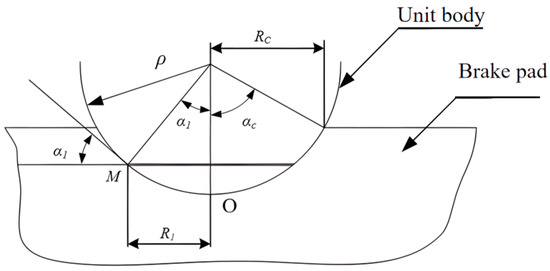 In the braking process, due to the high modulus of elasticity of both the brake drum and brake pad materials, the elastic deformation of their contact is relatively small, the depth of the unit body pressed into the surface of the brake pad is small, and the radius of the contact surface RC formed by them is also small. Therefore, there is: