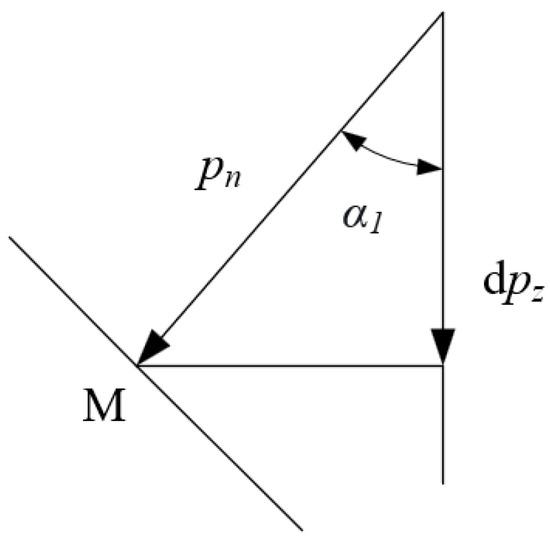The pressure dpZ in Equation (3) is along the Z-axis, in the vertical direction, while pn in Equation (2) is the normal positive pressure between the two. Since the contact surface between the two is spherical and not horizontal, the tangent plane at point M is at an angle α1 to the horizontal (see Figure 13). Therefore, the direction of pn does not coincide with the direction of dpZ, so the positive pressure pn induced by the pressure dpZ in the vertical direction in Equation (3) in the direction normal to the contact surface should be found out first. Then, the amount of frictional wear produced by this microcircle on the unit for the brake pad should be found out by substituting pn into Equation (2). For this purpose, a local enlargement at point M in Figure 12 is made to obtain Figure 13.