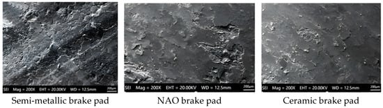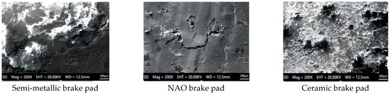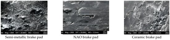 The semi-metallic, ceramic, and NAO brake pads were machined into rectangular specimens, each measuring 120 × 30 × 10 mm. The microstructures of these specimens are depicted in Figure 4.