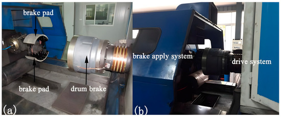 To gain a deeper understanding of the wear characteristics of various unitary bionic brake drums, this study performed a bench wear test on the brake drums. The test was conducted using a bench test machine, as shown in Figure 17.