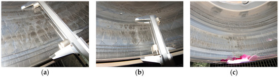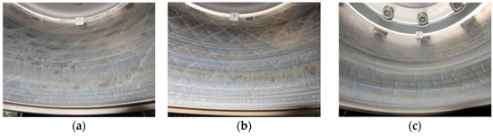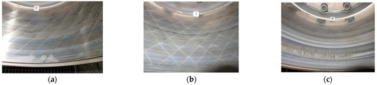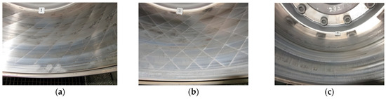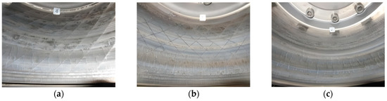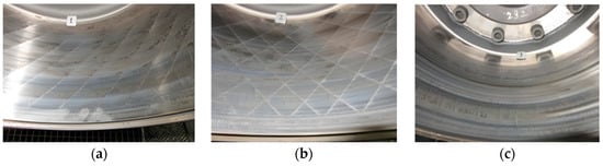 Photographs of the failure of each brake drum after different braking cycle times in the bench tests. (a) Photograph of striped unit laser-treated brake drum failure after 470 braking cycles; (b) photograph of grid unit laser-treated brake drum failure after 510 braking cycles; (c) photograph of untreated brake drum failure after 370 braking cycles.