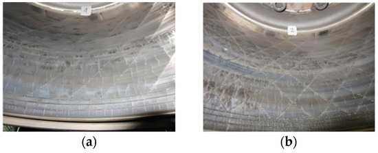 Surface cracking of each brake drum after 400 braking cycles in the bench tests. (a) Striped pattern brake drum; (b) grid pattern brake drum.