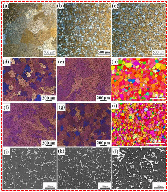 Wang et al. [60] studied the effects of RE additions on the microstructural evolution of the Mg-8Zn-4Al (ZA84) alloy and found that in the absence of RE, the ZA84 alloy exhibits a quasi-continuous network of τ phases and isolated φ phases to form a coarse dendritic structure (Figure 1j). Upon introducing 1.0 wt.% RE, the microstructure undergoes significant transformation, with the networked τ phases breaking into discontinuous, particle-like, or short-bar shapes (Figure 1k). Additionally, a small fraction of block-shaped phases (Mg3Al4Zn2RE) appears, reflecting the influence of RE in modifying the phase morphology and distribution. When the RE content is increased to 1.5 wt.%, the formation of Mg3Al4Zn2RE phases becomes more pronounced, indicating that higher RE concentrations promote the generation of these block-shaped phases. This microstructural refinement contributes to a uniform distribution of phases and reduced grain size, as illustrated by the relationship between RE content and grain boundaries [60]. However, the high density of RE elements and their high cost make this technique unfeasible for industrial-scale applications, hence impeding the widespread usage of RE alloying in large-scale Mg components [23].