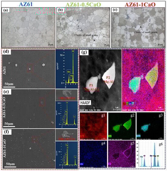 Microstructures of Mg alloys; optical micrograph of (a) AZ61, (b) AZ61-0.5CaO, and (c) AZ61-1CaO. SEM images with EDS point analysis of (d) AZ61, (e) AZ61-0.5CaO, and (f) AZ61-1CaO. (g–g6) HAADF-EDS mapping of AZ61-1CaO alloy showing Mg-Al and Mg-Al-Ca precipitates (reprinted from [64]).