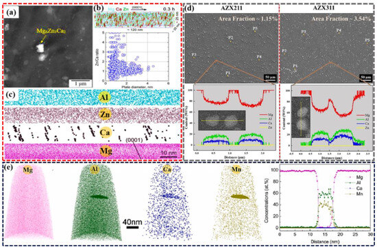 (a) TEM image showing precipitate formation and dispersion in Mg-Zn-Ca-Mn alloy; (b) 3D APT reconstruction image showing precipitation in Mg-0.3Ca; (c) 2D APT map showing distribution of Al, Zn, Ca, and Mg in ZAXME11100 alloy; (d) SEM images and EDS maps showing precipitate formation in AZX211 and AZX311 alloys; (e) 3D APT reconstruction image and line profile showing precipitate formation and their composition in Mg-3Al-1Ca-1Mn alloy (all figures reprinted from [49,65,66,67,68,69]).