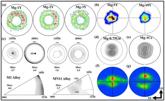 Texture variation with RE elements alloying (a) as-extruded Mg-1Y alloy, Mg-2Y alloy, and Mg-3Y alloy; (b) Mg-5Y alloy, and Mg-10Y alloy. (c) Recalculated (10-10) and (0001) pole figures and inverse pole figures of M1 and MN11 alloys; (d) pole figure for Mg-0.75Gd alloy; (e) pole figure for Mg-1Ce alloy, (f) Mg-0.5RE, and (g) Mg–2Zn–0.5RE (all figures are reprinted from [76,77,78,79,80,81]).