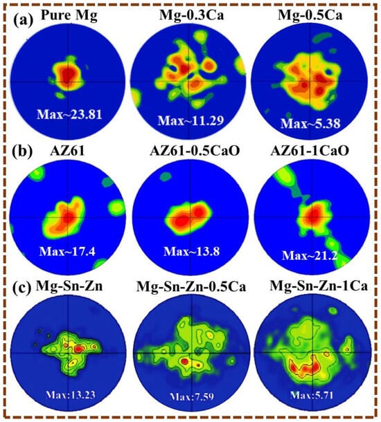 Pole figures showing texture variation with non-RE elements alloying (a) pure Mg, Mg-0.3Ca alloy, and Mg-0.5Ca alloy; (b) AZ61 alloy, AZ61-0.5CaO alloy, and AZ61-1CaO alloy; (c) Mg-Sn-Zn alloy, Mg-Szn-Zn-0.5Ca alloy, and Mg-Sn-Zn-1Ca alloy (all figures are reprinted from [64,82,83]).