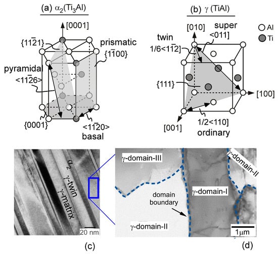 Crystal structures and slip systems of (a) α2-Ti3Al phase and (b) γ-TiAl phase, (c) SEM image of lamellar structure in a PST-TiAl alloy, consisting of α2-Ti3Al phase, γ-matrix, and γ-twin phases, adapted from [], 2015, Elsevier, (d) domain structures in a γ-lamellae, adapted from [], 2003, Elsevier.