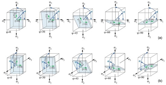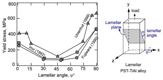 The yield stresses of PST-lamellar alloys vary significantly with lamellar orientations. The degree of variation depends on the alloy compositions and key microstructural parameters, such as lamellar spacing and domain size [,,,,,]. Figure 2 illustrates the yield anisotropy with respect to the lamellar plane angle, φ under uniaxial loading conditions. The general trend reveals a U-shaped variation in the yield stress. At φ = 0° and φ = 90° lamellar orientations higher yield stresses are observed, while lower yield stresses occur for intermediate lamellar orientations, φ = 15–75°. The lowest yield stress is recorded at φ = 45°. Lamellar orientations associated with higher yield stresses are referred to “hard orientations”, while those resulting in lower yield stresses are termed “soft orientations”.