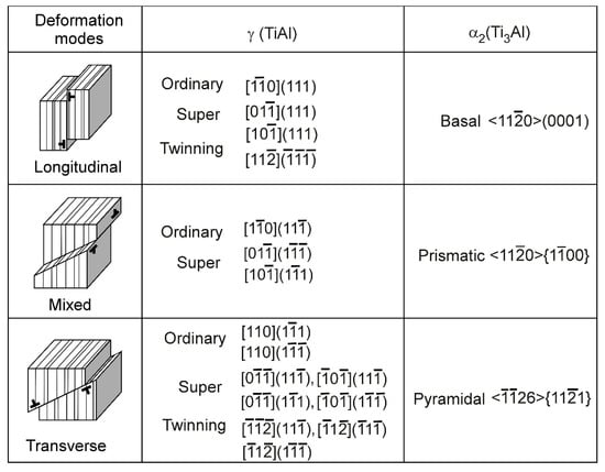Slip systems in γ-TiAl and α2-Ti3Al phases, grouped according to three deformation modes, adapted from [], 2003, Elsevier.
