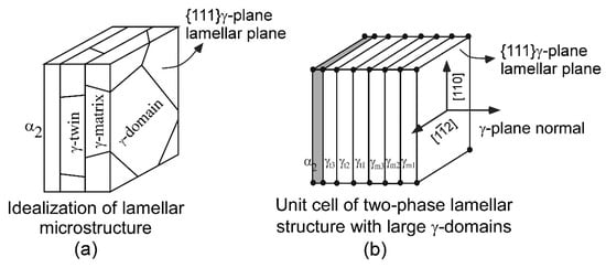 The PST-TiAl alloy is characterized by a two-phase crystal comprising of α2-Ti3Al and γ-TiAl phases in the form of lamellar structure []. The α2-Ti3Al lamellar phase has a hexagonal ordered D019 crystal structure, while the γ-TiAl lamellar phase has a face-cantered tetragonal L10 crystal structure (Figure 1a,b). The fully lamellar structure is formed by alternating layers of these two phases, where multiple γ-phases are interspersed between two α2-phases. The γ-phases consist of matrix and twin lamellae where numerous γ-phase domains are coherently attached (Figure 1c,d). The closely packed (0001)α2- and {111}γ-planes, as well as the closely packed directions <11-20>α2 and <110>γ, are parallel []. A specific crystallographic orientation relationship, named Blackburn Orientation Relationship [], is found among γ-domains and α2-phases. The matrix-domain variants exhibit 0°, 120°, and 240° orientations, while the twin variants display 180°, 300° and 60° orientations. The overall deformation of the lamellar structure is averaged by individual γ-domain deformation and the deformation of adjacent α2-lamellae.