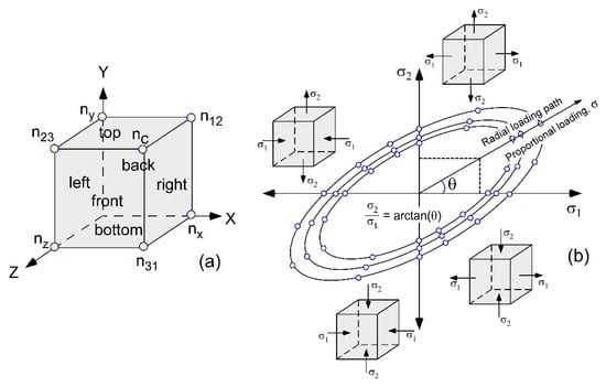 In Figure 6a, the angle of σ2 direction varies with the lamellar plate normal, where the σ1-direction is always parallel to transverse to the lamellar plane. The applied proportional stress, σ, acts on (σ1-σ2)-plane. In Figure 6b, the loading angle of σ2 and σ3 both changes with respect to the oriented lamellar normal. The applied proportional stress, σ, acts on (σ3-σ2)-plane. Thus, the plane stress yield surface behaviour at (σ1-σ2) plane and (σ3-σ2) plane, obtained by applying radial load-path stress, σ, will not be the same. This assessment of yield surface behaviour over different stress-planes provides information how plasticity evolves for differently oriented lamellar microstructure under the multi-axial loading.