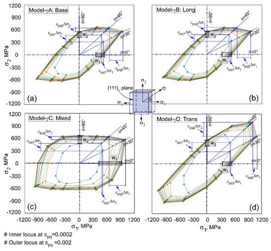 The yield surfaces generated from these models are shown in the (σ1-σ2) stress plane in Figure 8. Here, the inner and outer loci represent equivalent plastic strains, εpq, of 0.0002 and 0.002, respectively. The elongated yield contours depict the yield surface evolution with increasing εpq, while the expansion of these loci contours indicates the strain hardening behaviour specific to each model: α2A, α2B, α2C, and α2D.