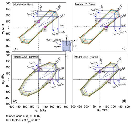 Figure 8a,b display yield loci contours for the Models α2A and α2B as narrow, elongated hexagons with varying arm lengths. For the Model-α2C, the yield loci contours are rounded and widened, whereas the Model-α2D presents slightly narrower contours that revert to a hexagonal shape with modestly rounded arms. Correlating these shapes with slip strength parameters in Table 4, the basal slip parameters appear to have minimal impact on the yield loci evolution. However, along the σ1 and σ2 axes (representing uniaxial tensile cases), contours expand more for the Models α2C and α2D, likely due to the higher average slip strength, g0, for the prismatic and pyramidal slip systems. The Model-α2C yields more rounded contours due to a higher prismatic slip parameter, while the Model-α2D shows only slight changes in shape due to increased pyramidal slip strength.