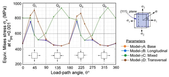 The variation of equivalent Mises stress, σV with the changes of load-path angles provides a quantitative measure of the material’s effective anisotropy approximated for unidirectional loading. In this analysis, the σV was calculated for plane stress condition at an equivalent plastic strain, εpq = 0.001, spanning the entire load-path angle range, θ ∈ [0°, 360°], regarding the Q1 to Q4 quadrants of (σ1-σ2) stress-plane. Figure 9 shows the results for the Models γA through γD, corresponding to the variations of CP parameters regarding longitudinal, mixed, and transversal deformation modes.