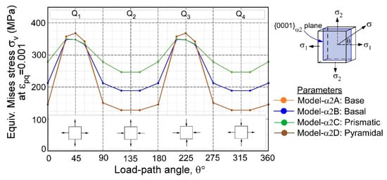 The equivalent Mises yield stress for the α2-Ti3Al single phase under the deformation modes involving basal, prismatic, and pyramidal slips is shown in Figure 10. Across all models, the σV curves exhibit peak values in the Q1 and Q3 quadrants, where biaxial tension or biaxial compression is applied along 45° (Q1) or 225° (Q3) load angles. Conversely, the minimum values occur in the Q2 and Q4 quadrants, where biaxial tension-compression loading is applied along 135° (Q2) or 315° (Q4).