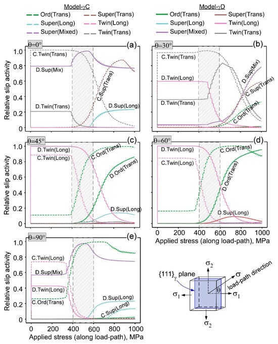 The yield surface in lamellar TiAl alloy is shaped by both the microstructural and phase induced anisotropy. Additional numerical simulations are essential to elucidate the complex interactions of slips when considering the orientation of the lamellae and the loading direction. To clarify this relationship, a schematic illustration of the slip planes and slip directions with respect to the orientation of the lamellae and load-path direction over a 2D stress plane is shown in Figure 6.