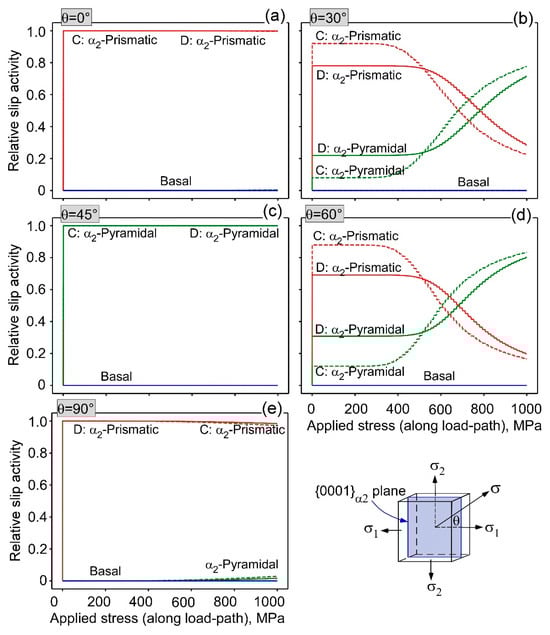 The base parameter set in Model-α2A was taken from the validated CPFE analysis described in []. The CP parameters were systematically adjusted for the basal, prismatic, and pyramidal slip systems by specific scaling factors from this base set, creating variations designated as the Model-α2B, Model-α2C, and Model-α2D, respectively.