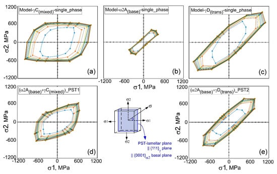 This analysis provides a clear understanding of the local variations in yield anisotropy of the oriented lamellar grains under biaxial loading on the (σ1-σ2)-plane. Additionally, applying biaxial loading on the (σ3-σ2)-plane allows for further evaluation of yield anisotropy, where the σ3 stress component remains parallel to the lamellar-plane normal.