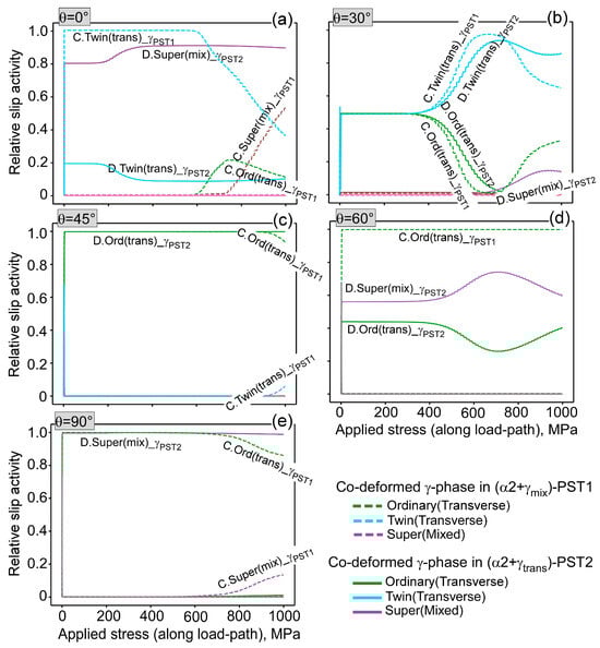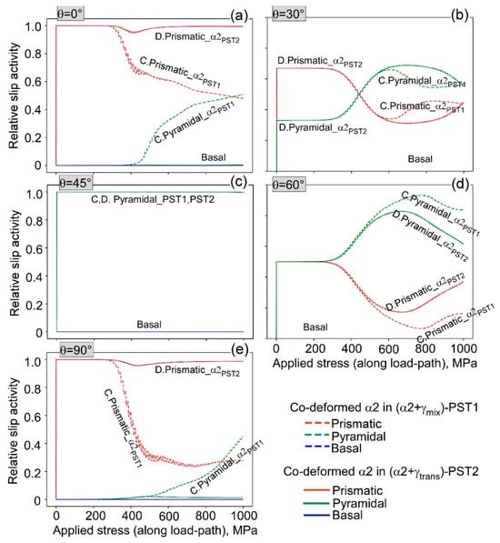 The initiation of slips corresponding to various deformation modes (as shown in Figure 3) was examined by calibrating the slip strength, g0 and hardening modulus, h0. Since the evolution of resolved shear stresses on the slip systems depend on the angle between the load and lamellar plane, the CP modelling over a range of lamellar orientations, φ, from 0° to 90° allow one to model direction dependent yield of the lamellar microstructure. The predicted anisotropic yields were then fitted with the corresponding yield points determined experimentally. It was demonstrated that, depending on the lamellar orientation, certain deformation modes dominate, with specific slip system groups playing a pivotal role in the plastic deformation process []. Thus, the orientation-dependent active slip systems and their corresponding CP parameters can be estimated. The validated parameters for slip strengths and hardening modulus are summarized in Table 2.