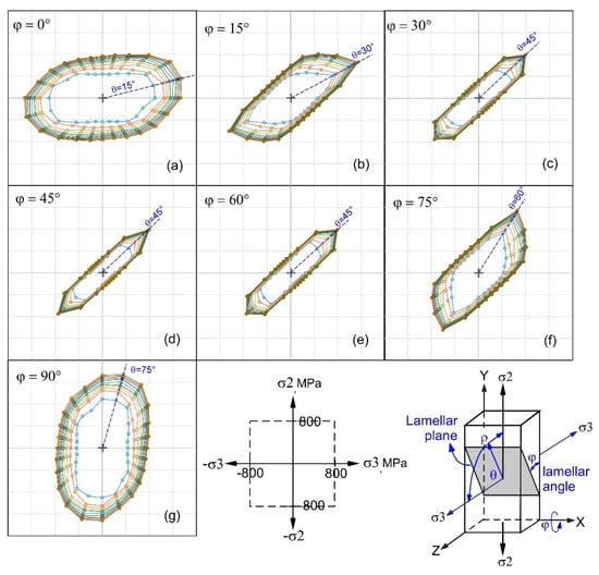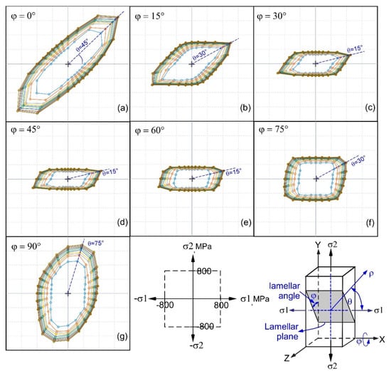 With further inclination of the lamellae to φ = 60°, 75°, and 90°, the yield surface width gradually increases, transforming from a parallelogram to rectangular and ultimately to elliptical shapes (Figure 16e–g). The major axis of the yield loci contour rotates from 15° to 30° and then to 75° as the load-path angles change.