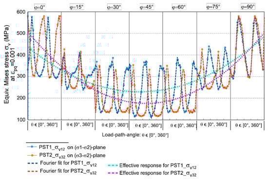 To assess the anisotropic yield response due to load-angle variations across the (σ1-σ2) and (σ3-σ2) orthogonal planes, the equivalent Mises yield stresses, σV, were evaluated for both the PST1 and PST2 models. This evaluation considered seven distinct lamellar orientations, φ ∈ [0°, 90°] in 15° increments, and 24 distinct load angles, θ ∈ [0°, 360°] in 15° increments. By connecting all yield points across the θ and φ spectra, two “wavy” curves were plotted, representing yield points calculated on the (σ1-σ2) and (σ3-σ2) stress planes. In Figure 18, these curves are denoted as PST1_σV12 and PST2_σV32, respectively.