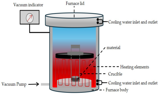 The experiments in this study were conducted using a high-temperature vertical vacuum furnace, as shown in Figure 1. This equipment is capable of maintaining a vacuum level as low as 5 Pa and achieving heating temperatures of up to 1873 K.