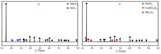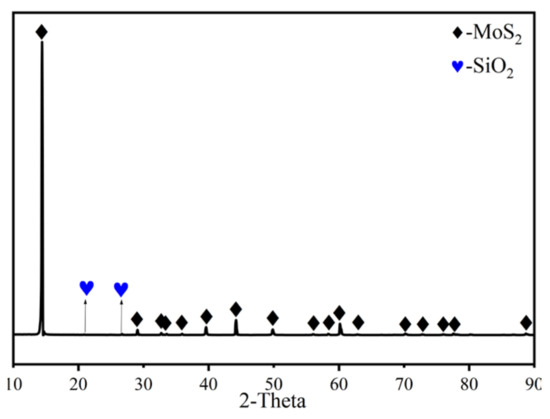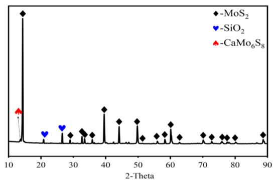 The chemical composition of the molybdenum concentrate is presented in Table 1 and shows that the most abundant elements are Mo and S, while the impurity elements include Si, Ca, Al, Fe, K, Pb, Cu, and others. The raw materials were analyzed using XRD and XRF, as shown in Figure 2. The results indicate that Mo and S predominantly exist in the form of MoS2, while the impurity element Si mainly exists as SiO2.