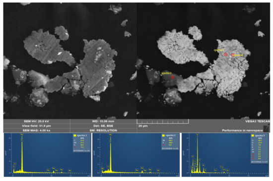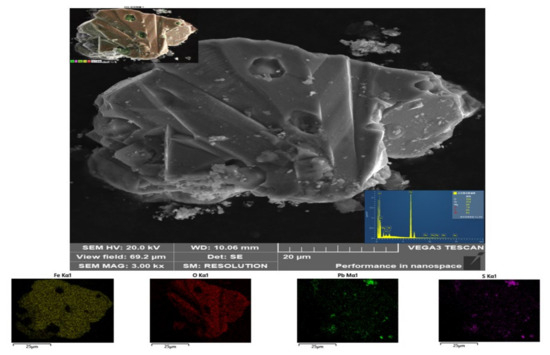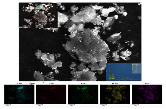 Since other impurities in the molybdenum concentrate could not be detected by XRD, the results of SEM-EDS, ICP-OES, and XRF were used to analyze the forms of existence of other small amounts of impurities. Figure 3 shows the SEM-EDS spectrum of the experimentally collected condensate, which shows that the distributions of the impurity elements Pb and S are closely related. Based on the EDS results, it was found that the atomic ratios of Pb and S were approximately equal, leading to the conclusion that Pb primarily existed in the form of PbS. In addition, Figure 4 shows the SEM-EDS spectrum of the condensate, where the distributions of Si, O, and K were almost identical. Combined with the energy spectrum results and atomic ratios, it was determined that K existed in the form of K2O, while Si existed as SiO2. Through Figure 5, it was observed that the distribution of Fe correlated closely with that of O, and the atomic ratio of Fe to O was approximately 2:3, indicating that Fe predominantly existed in the form of Fe2O3. Additionally, Bai et al. [21] investigated the removal of iron sulfides from molybdenum concentrate through vacuum chlorination. This method was used to verify the forms of iron present, and the iron content was measured using ICP-OES. The results showed that the Fe content decreased from 0.47 wt% to 0.0905 wt%. Consequently, it was concluded that iron exists not only in the form of Fe2O3 but also as FeS.