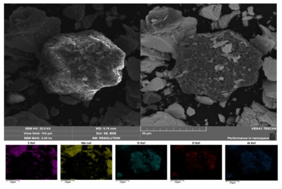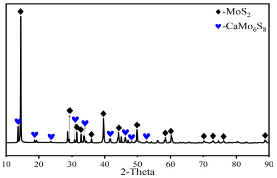 Figure 6 shows the SEM-EDS spectrum of the raw material, which indicates that MoS2 primarily exists in a layer structure. The distributions of Si, O, and Al are similar and almost completely separated from MoS2, suggesting that the impurity element Al exists in the form of Al2O3. The presence of the impurity element Ca is not found in the form of SEM-EDS, so it has to be derived by other methods. During the experiments carried out at different temperatures, a new substance was found in the residue after the temperature exceeded 1273 K [23], and the XRD diffraction pattern indicated that this substance was CaMo6S8, as shown in Figure 7. It has been found that MoS2 reacts violently with CaO when the temperature reaches 1273 K to form the intermediate product CaMo6S8. Therefore, analytically pure MoS2 (98.5 wt%) was mixed with analytically pure CaO (96.0 wt%) at 1373 K. Experiments were carried out and the presence of the substance CaMo6S8 was also found in the XRD diffraction pattern of its residue, as shown in Figure 8, which was produced by the reaction between MoS2 and CaO. Therefore, the existence of a small amount of Ca in the raw material is in the form of CaO. In addition to this, due to the detection means having certain limitations, there was no way to detect the trace elements in it, so some of the elements were not taken into account. Trace elements As and Bi were found by electron microscopy of the condensate, which was mainly distributed similarly to S, so that As exists as As2S3 and Bi as Bi2S3.