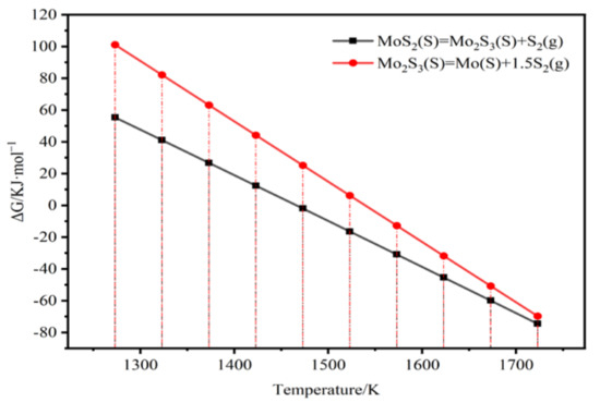From Figure 9, it was determined that the decomposition temperature of MoS2 under a vacuum of 5 Pa is approximately 1467 K. At 1473 K, MoS2 begins to decompose gradually, forming Mo2S3. As the temperature continues to rise, the reaction is further driven in the forward direction, leading to a more pronounced decomposition of MoS2.